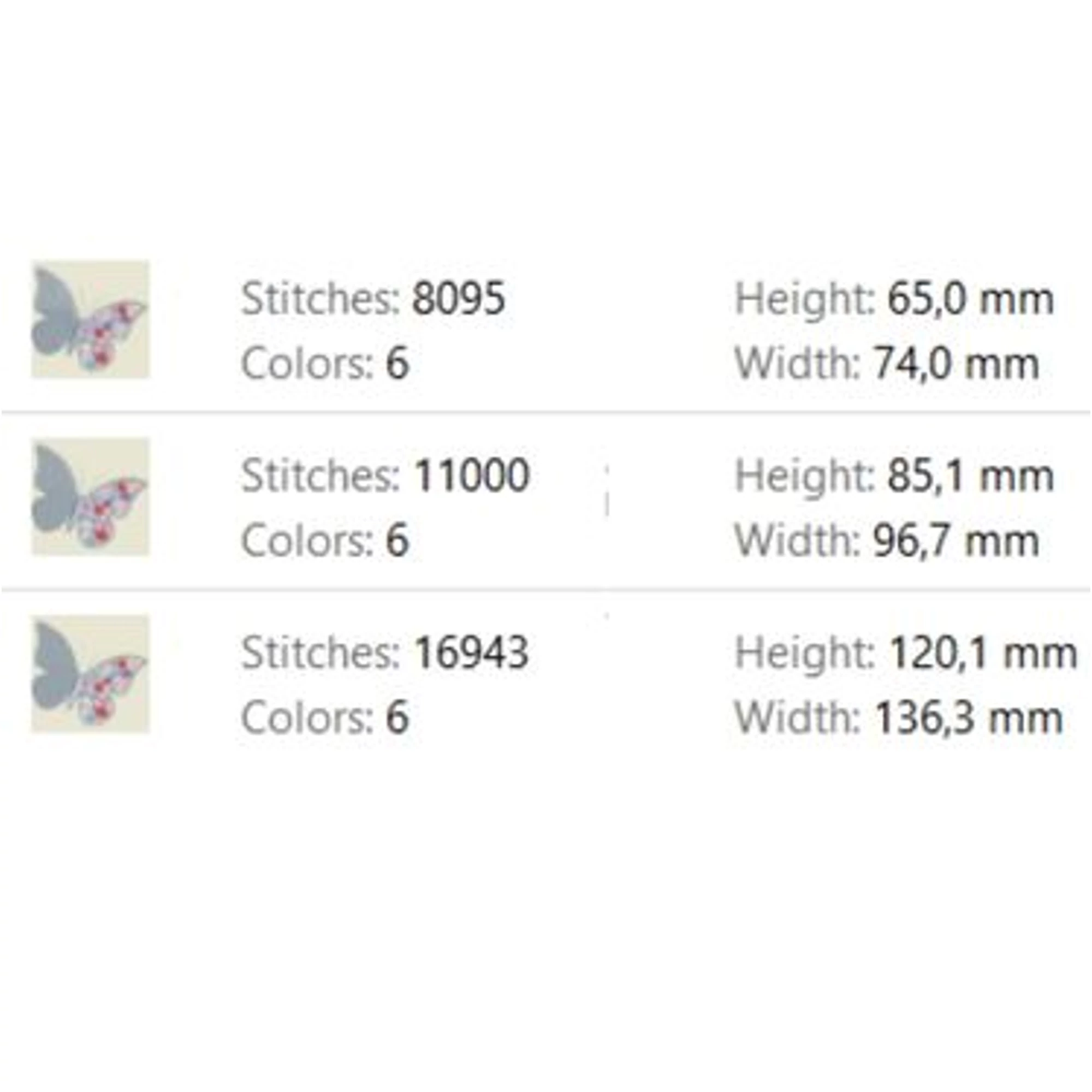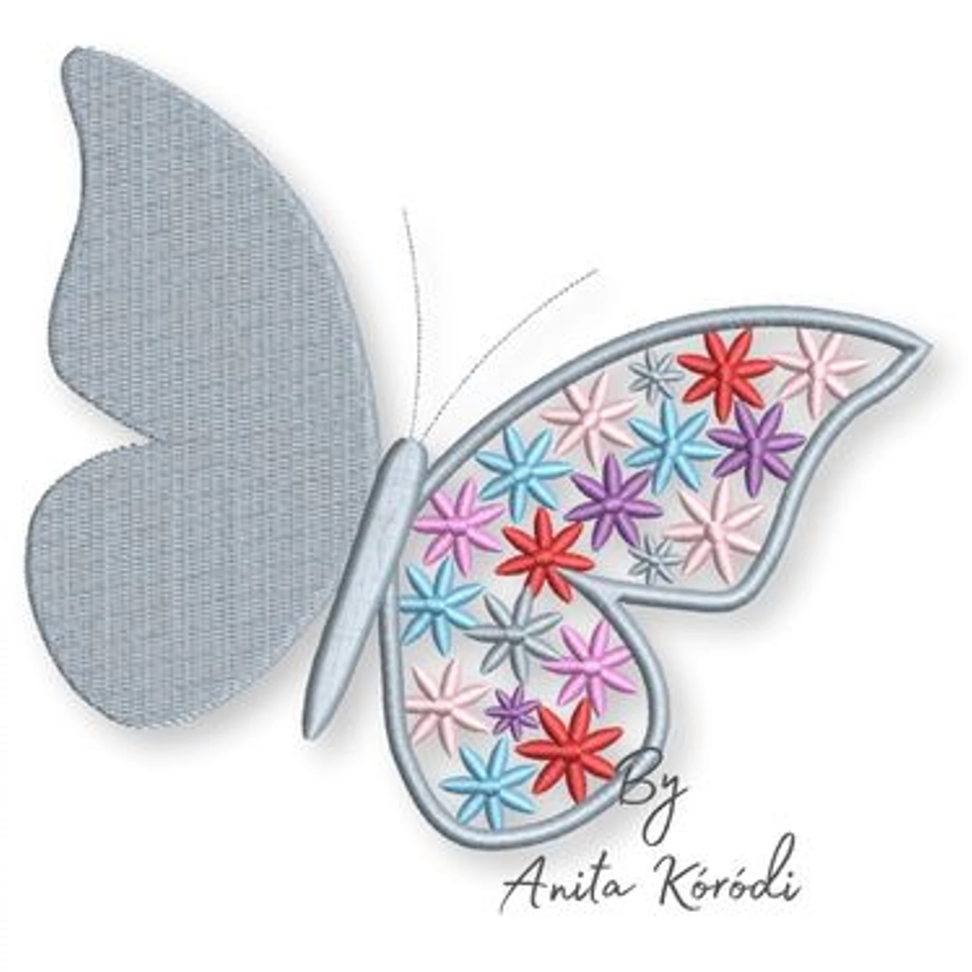 - This floral butterfly embroidery design features a delicate butterfly with one wing beautifully decorated with colorful embroidered flowers.