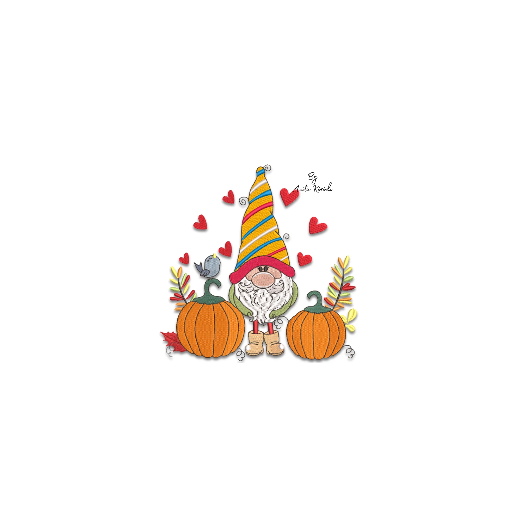 Celebrate the fall season with this adorable autumn gnome embroidery design, featuring pumpkins, hearts, and colorful leaves. Perfect for decorating seasonal clothing, tote bags, kitchen towels, or Thanksgiving home décor.